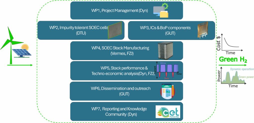 CHARGE is organized into seven work packages spanning cell development, interconnect optimization, stack manufacturing, performance testing, techno-economic analysis, and dissemination. The project runs from 2026 to 2028, coordinated by DynElectro (Denmark), with partners DTU (Denmark), FZJ (Germany), GUT (Poland), COAT-IT (Poland), and VERMES (Germany).